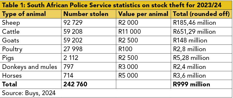 Accurate and up-to-date statistics are scarce. South African Police Service (SAPS) statistics on stock theft for 2023/24 were provided to Dr Jane Buys, safety and risk analyst at Free State Agriculture. With conservative estimates applied to these statistics, Table 1 reflects the number of animals stolen during this period.