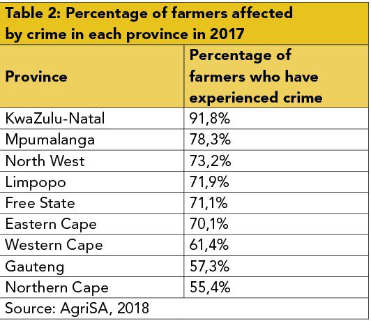 The same AgriSA study mentioned previously reported the number of farmers affected by crime in each province in 2017 (see Table 2). The figure is likely to be even higher now.
