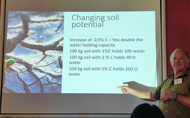 Uys referred to research that found that the soil’s water-holding capacity could almost be doubled with every 1% increase in carbon. For instance, the water-holding capacity of 100kg soil could increase from 20ℓ to 40ℓ if the carbon content of this soil were increased from 1% to 2%. It would increase to 200ℓ if the carbon content of this soil was raised to 5%.